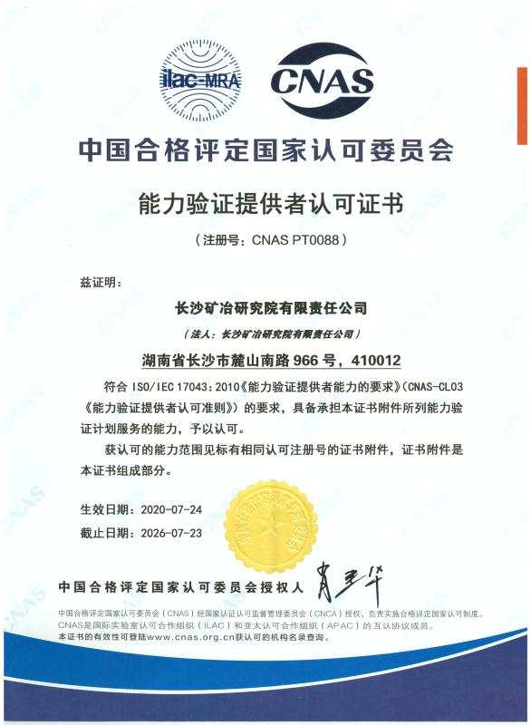長(zhǎng)礦檢測(cè)公司是目前湖南省唯一一家中國(guó)合格評(píng)定國(guó)家認(rèn)可委員會(huì)(CNAS)認(rèn)可的能力驗(yàn)證提供者(證書編號(hào):CNAS PT0088),資質(zhì)范圍涵蓋礦石、鋰電材料、土壤、水樣、鋼鐵合金測(cè)試等多個(gè)領(lǐng)域,可提供氫氧化鎳鈷錳、鎳鈷錳酸鋰、碳酸鋰、鐵礦石、銅鉛鋅礦等十余種產(chǎn)品的化學(xué)成分及粒度與比表面測(cè)試能力驗(yàn)證和測(cè)量審核服務(wù)。